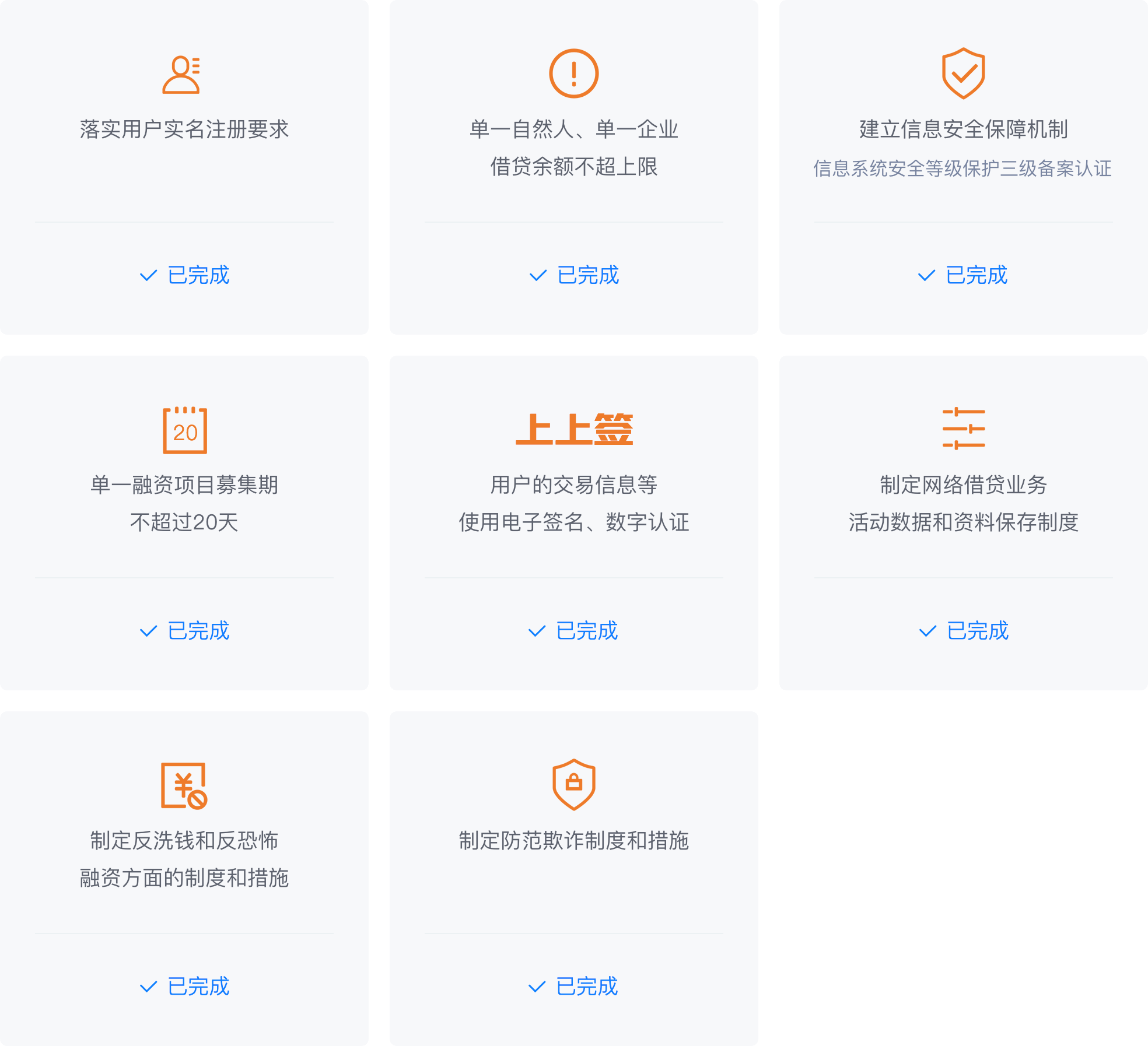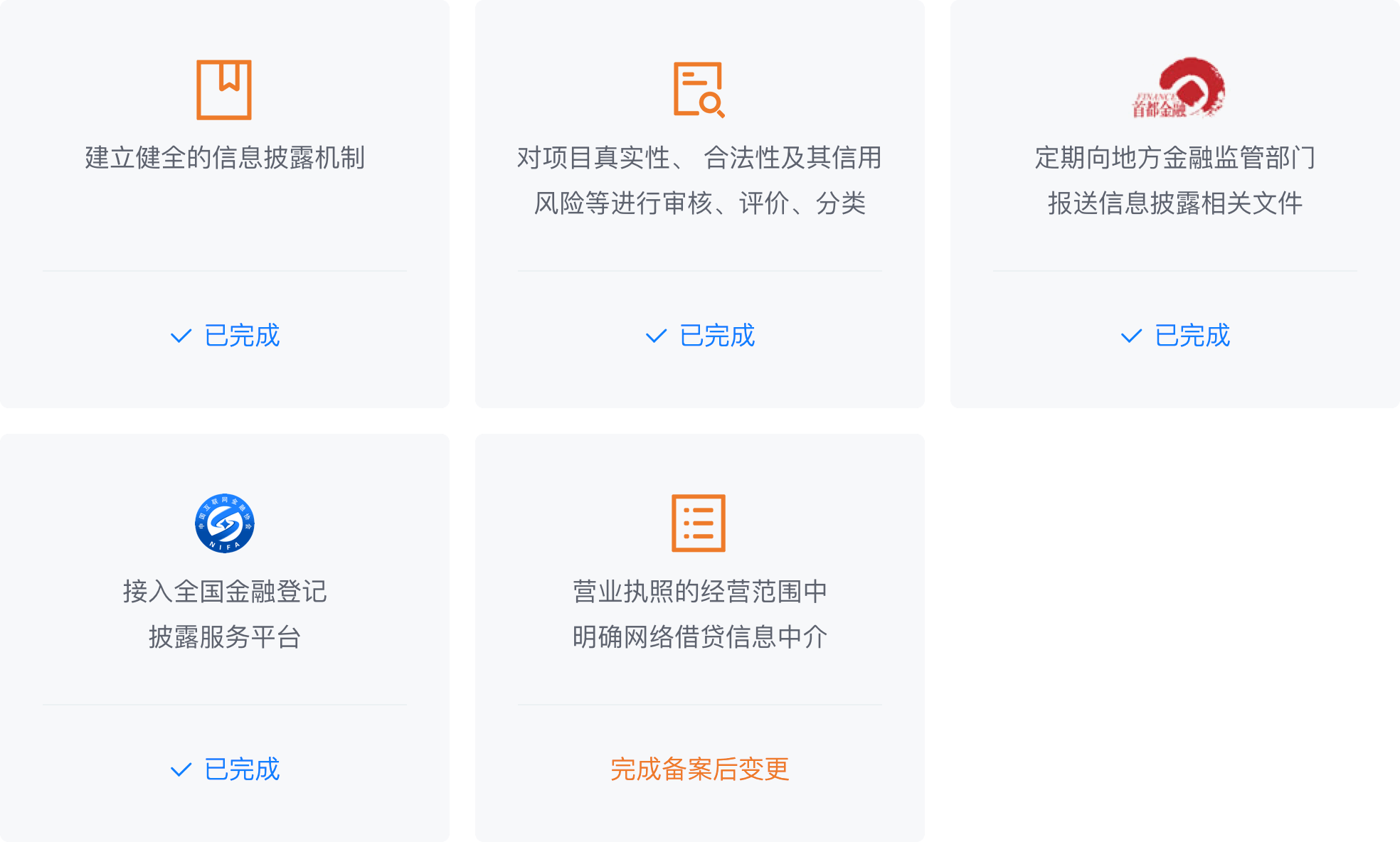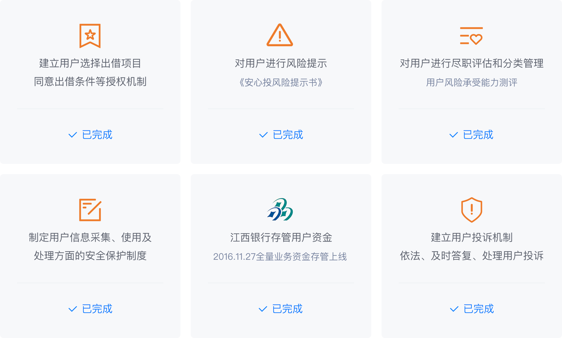为响应“网贷108条清单”及北京金融工作局《关于启动在京注册P2P网络借贷机构自查工作的通知》,安心投已完成相关的网贷合规自查工作,并于2018年10月15日正式向北京金融局提交了自查报告,标志着安心投向更加健康稳健发展迈进了一步。 平台自查问题清单共计108个项目,现将重点内容及自查整改进度公布如下: